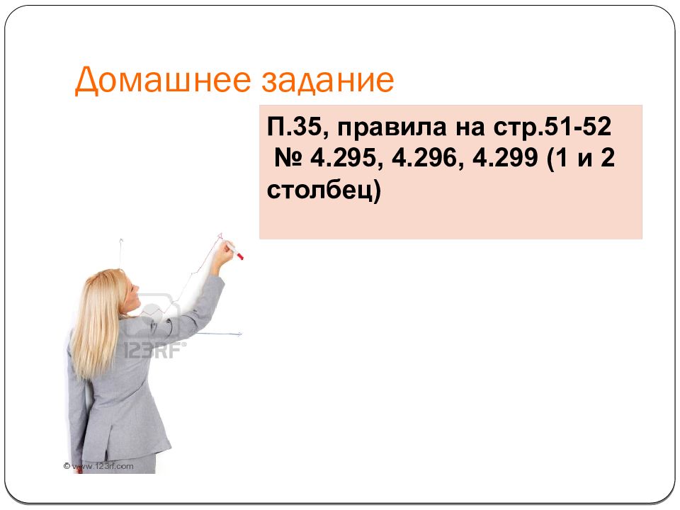 П.35, правила на стр.51-52 № 4.295, 4.296, 4.299 (1 и 2 столбец)