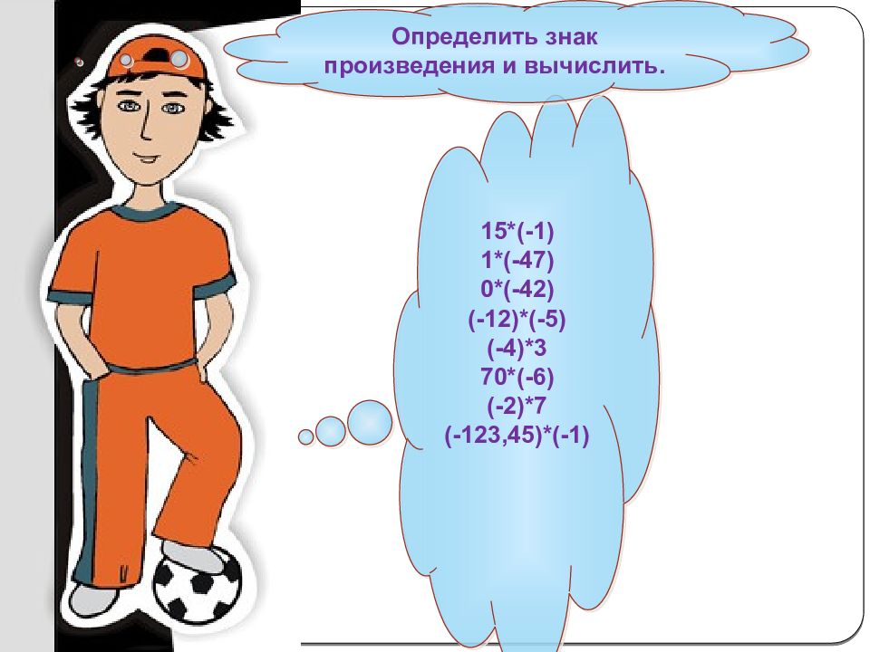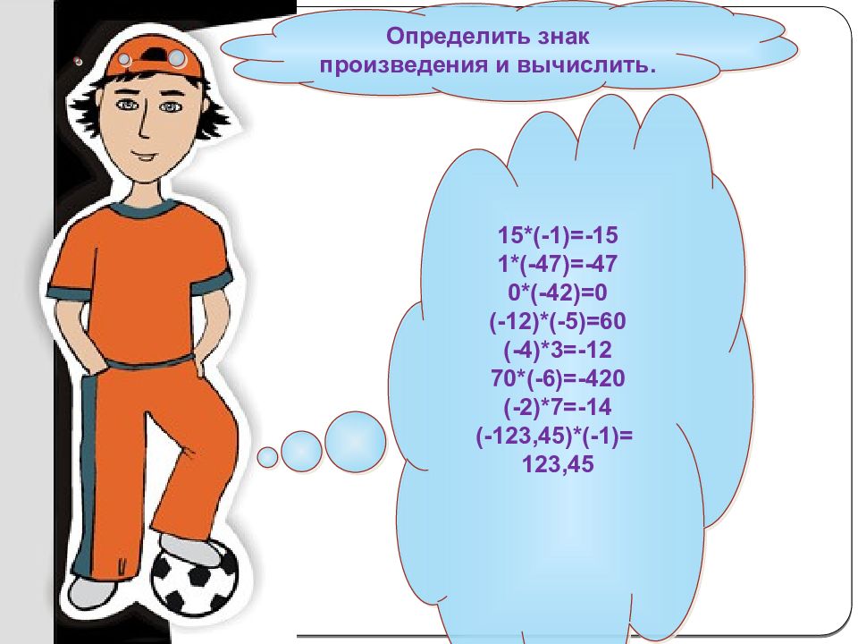 15*(-1) 1*(-47) 0*(-42) (-12)*(-5) (-4)*3 70*(-6) (-2)*7 (-123,45)*(-1) Определить знак произведения и вычислить.