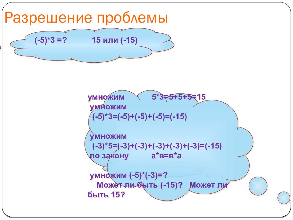 (-5)*3 = ? 15 или (-15) умножим 5*3=5+5+5=15 умножим (-5)*3=(-5)+(-5)+(-5)=(-15) умножим (-3)*5=(-3)+(-3)+(-3)+(-3)+(-3)=(-15) по закону а*в=в*а умножим (-5)*(-3)=? Может ли быть (-15)? Может ли быть 15?