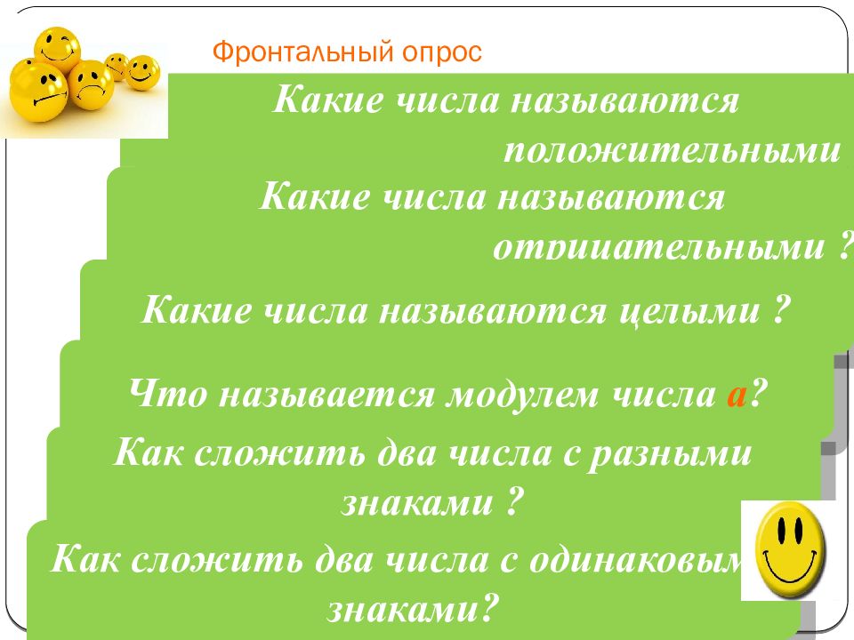 Какие числа называются положительными ? Какие числа называются отрицательными ? Фронтальный опрос Какие числа называются целыми ? Что называется модулем числа а ? Как сложить два числа с разными знаками ? Как сложить два числа с одинаковыми знаками?