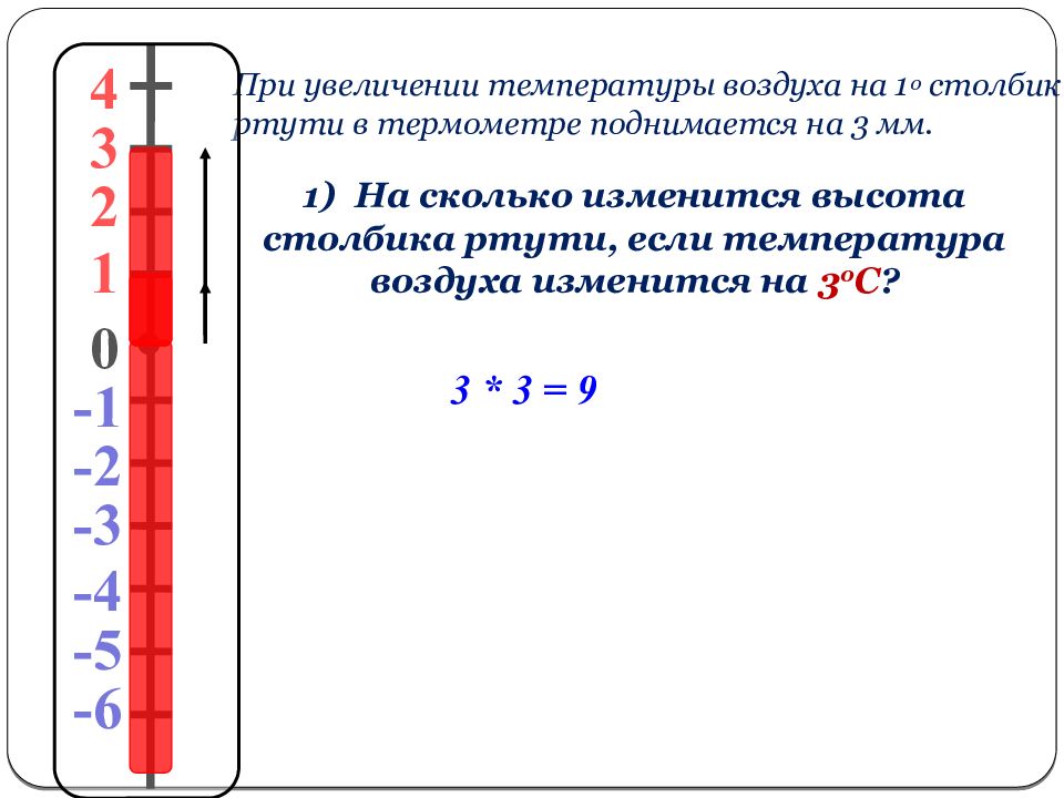 4 3 2 1 -1 0 -2 -3 -4 -5 -6 3 * 3 = 9 1) На сколько изменится высота столбика ртути, если температура воздуха изменится на 3 0 С ?