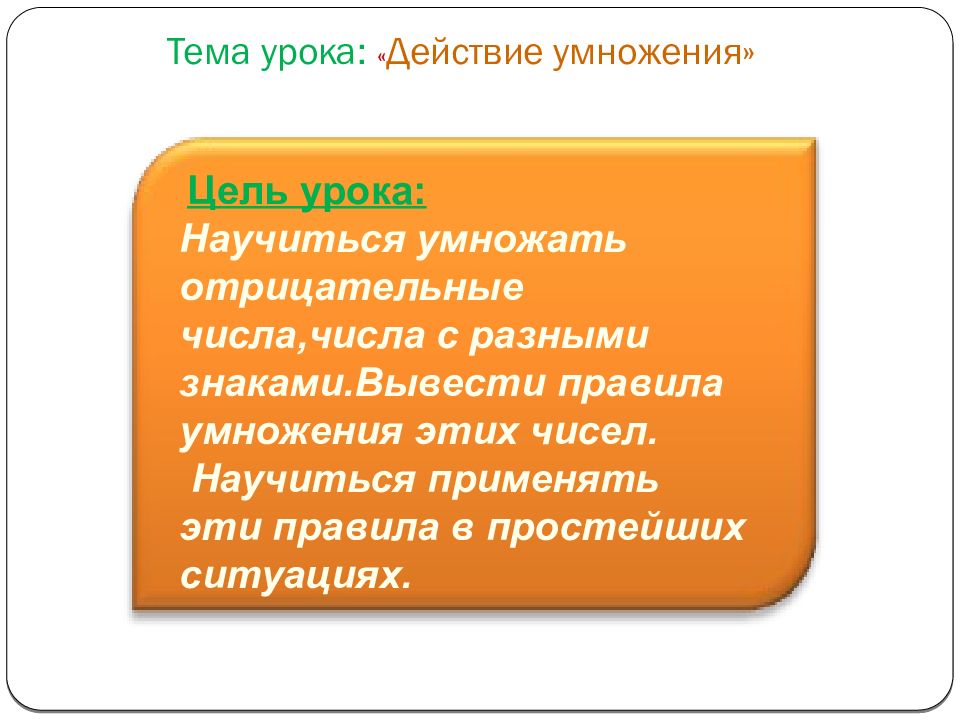 Цель урока: Научиться умножать отрицательные числа,числа с разными знаками.Вывести правила умножения этих чисел. Научиться применять эти правила в простейших ситуациях.