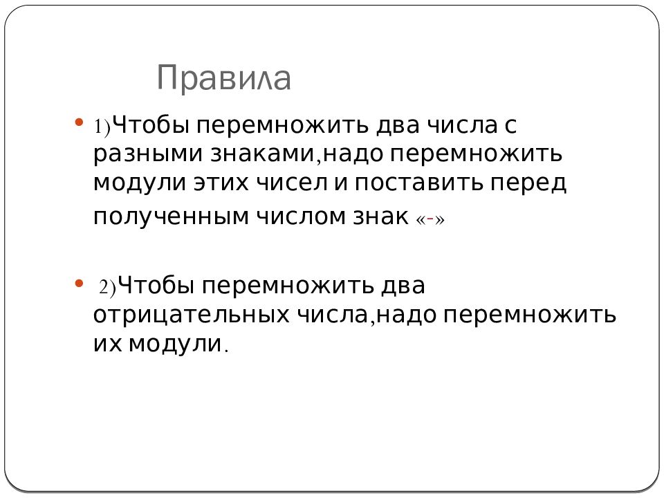 1)Чтобы перемножить два числа с разными знаками,надо перемножить модули этих чисел и поставить перед полученным числом знак « - » 2)Чтобы перемножить два отрицательных числа,надо перемножить их модули.