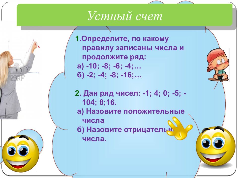 1.Определите, по какому правилу записаны числа и продолжите ряд: а) -10; -8; -6; -4;… б) -2; -4; -8; -16;… 2. Дан ряд чисел: -1; 4; 0; -5; -104; 8;16. а) Назовите положительные числа б) Назовите отрицательные числа. Устный счет