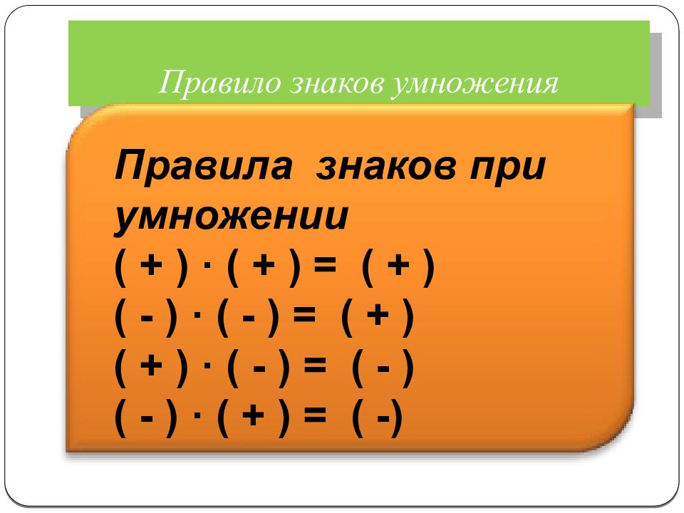 Правила знаков при умножении ( + ) · ( + ) = ( + ) ( - ) · ( - ) = ( + ) ( + ) · ( - ) = ( - ) ( - ) · ( + ) = ( -)