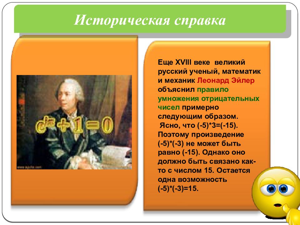 Еще XVIII веке великий русский ученый, математик и механик Леонард Эйлер объяснил правило умножения отрицательных чисел примерно следующим образом. Ясно, что (-5)*3=(-15). Поэтому произведение (-5)*(-3) не может быть равно (-15). Однако оно должно быть связано как-то с числом 15. Остается одна возможность (-5)*(-3)=15. Историческая справка