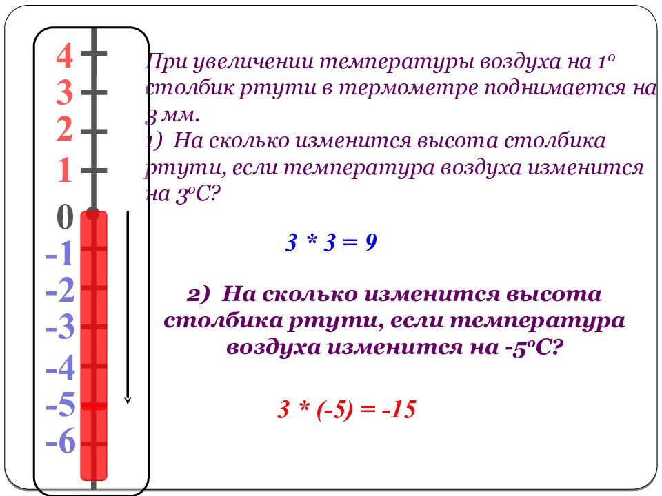 4 3 2 1 -1 0 -2 -3 -4 -5 -6 3 * 3 = 9 2) На сколько изменится высота столбика ртути, если температура воздуха изменится на -5 0 С? 3 * (-5) = -15