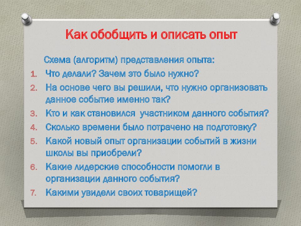 Схема (алгоритм) представления опыта: Что делали? Зачем это было нужно? На основе чего вы решили, что нужно организовать данное событие именно так? Кто и как становился участником данного события? Сколько времени было потрачено на подготовку? Какой новый опыт организации событий в жизни школы вы приобрели? Какие лидерские способности помогли в организации данного события? Какими увидели своих товарищей?