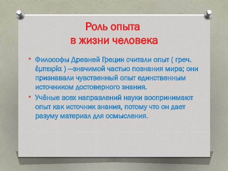 Философы Древней Греции считали опыт ( греч. έμ πειρία ) —значимой частью познания мира; они признавали чувственный опыт единственным источником достоверного знания. Учёные всех направлений науки воспринимают опыт как источник знания, потому что он дает разуму материал для осмысления.