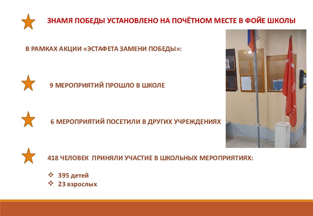 418 ЧЕЛОВЕК ПРИНЯЛИ УЧАСТИЕ В ШКОЛЬНЫХ МЕРОПРИЯТИЯХ: 395 детей 23 взрослых 9 МЕРОПРИЯТИЙ ПРОШЛО В ШКОЛЕ 6 МЕРОПРИЯТИЙ ПОСЕТИЛИ В ДРУГИХ УЧРЕЖДЕНИЯХ ЗНАМЯ ПОБЕДЫ УСТАНОВЛЕНО НА ПОЧЁТНОМ МЕСТЕ В ФОЙЕ ШКОЛЫ В РАМКАХ АКЦИИ «ЭСТАФЕТА ЗАМЕНИ ПОБЕДЫ»: