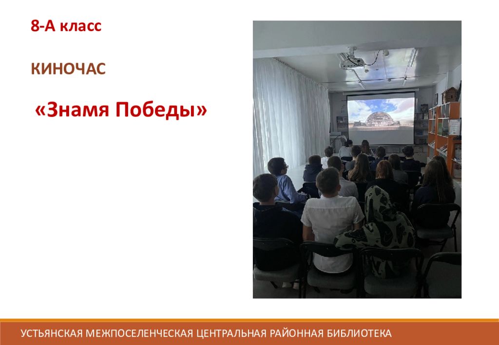 8-А класс КИНОЧАС «Знамя Победы» УСТЬЯНСКАЯ МЕЖПОСЕЛЕНЧЕСКАЯ ЦЕНТРАЛЬНАЯ РАЙОННАЯ БИБЛИОТЕКА