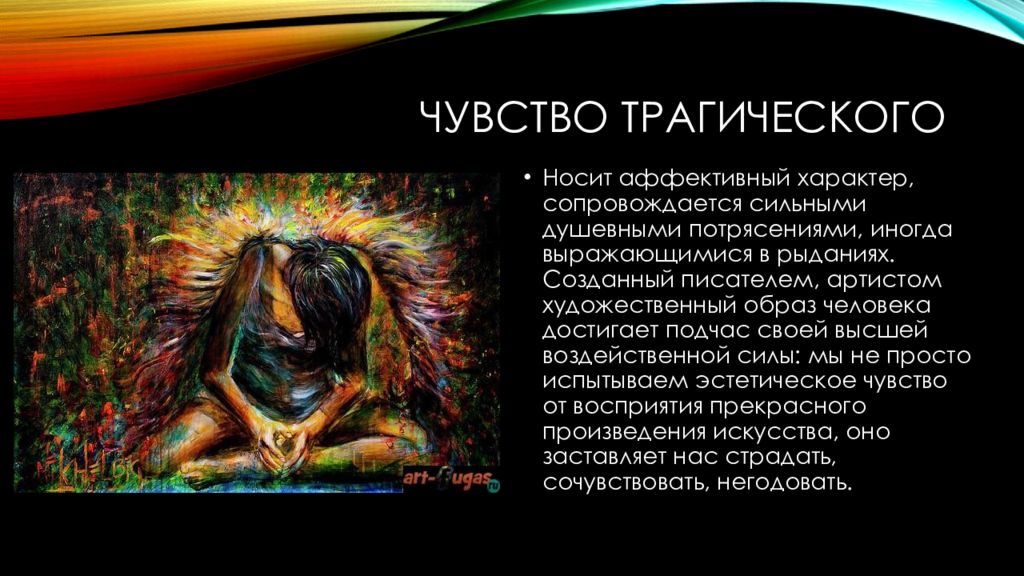 Носит аффективный характер, сопровождается сильными душевными потрясениями, иногда выражающимися в рыданиях. Созданный писателем, артистом художественный образ человека достигает подчас своей высшей воздейственной силы: мы не просто испытываем эстетическое чувство от восприятия прекрасного произведения искусства, оно заставляет нас страдать, сочувствовать, негодовать.