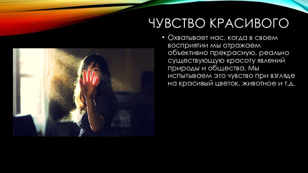 Охватывает нас, когда в своем восприятии мы отражаем объективно прекрасную, реально существующую красоту явлений природы и общества. Мы испытываем это чувство при взгляде на красивый цветок, животное и т.д.