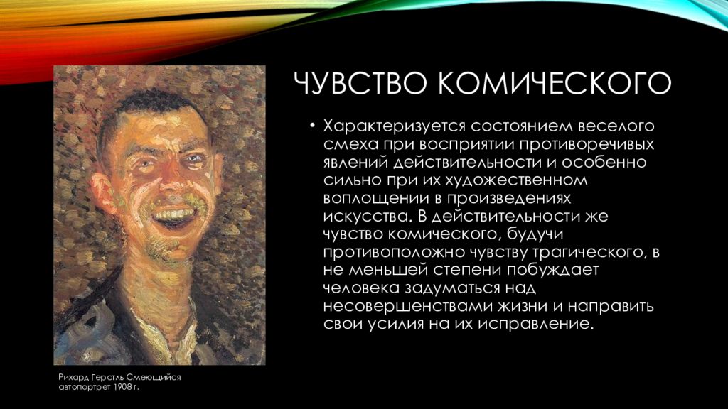 Характеризуется состоянием веселого смеха при восприятии противоречивых явлений действительности и особенно сильно при их художественном воплощении в произведениях искусства. В действительности же чувство комического, будучи противоположно чувству трагического, в не меньшей степени побуждает человека задуматься над несовершенствами жизни и направить свои усилия на их исправление. Рихард Герстль Смеющийся автопортрет 1908 г.