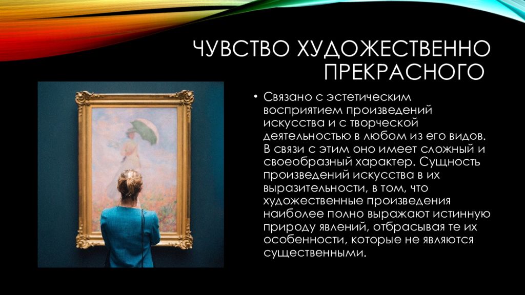 Связано с эстетическим восприятием произведений искусства и с творческой деятельностью в любом из его видов. В связи с этим оно имеет сложный и своеобразный характер. Сущность произведений искусства в их выразительности, в том, что художественные произведения наиболее полно выражают истинную природу явлений, отбрасывая те их особенности, которые не являются существенными.