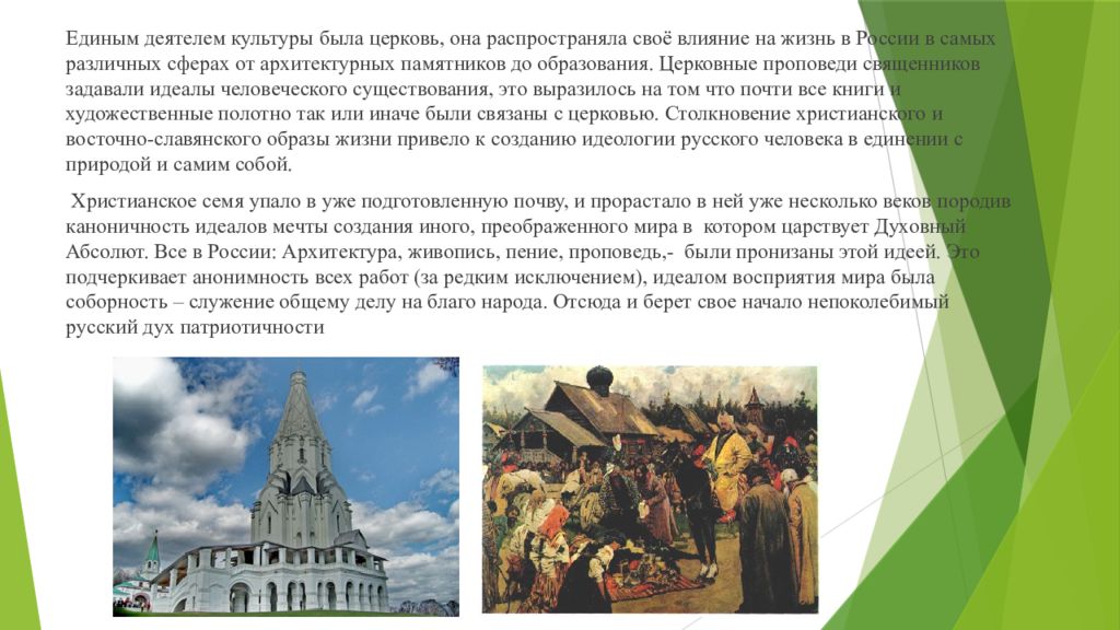Единым деятелем культуры была церковь, она распространяла своё влияние на жизнь в России в самых различных сферах от архитектурных памятников до образования. Церковные проповеди священников задавали идеалы человеческого существования, это выразилось на том что почти все книги и художественные полотно так или иначе были связаны с церковью. Столкновение христианского и восточно-славянского образы жизни привело к созданию идеологии русского человека в единении с природой и самим собой. Христианское семя упало в уже подготовленную почву, и прорастало в ней уже несколько веков породив каноничность идеалов мечты создания иного, преображенного мира в котором царствует Духовный Абсолют. Все в России : Архитектура, живопись, пение, проповедь,- были пронизаны этой идеей. Это подчеркивает анонимность всех работ (за редким исключением), идеалом восприятия мира была соборность – служение общему делу на благо народа. Отсюда и берет свое начало непоколебимый русский дух патриотичности