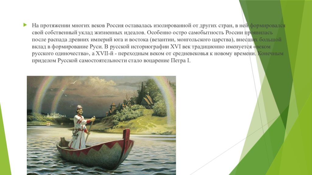 На протяжении многих веков Россия оставалась изолированной от других стран, в ней формировался свой собственный уклад жизненных идеалов. Особенно остро самобытность России проявилась после распада древних империй юга и востока ( везантии, монгольского царства), внесших большой вклад в формирование Руси. В русской историографии XVI век традиционно именуется «веком русского одиночества», а XVII-й - переходным веком от средневековья к новому времени. Конечным приделом Русской самостоятельности стало воцарение Петра I.