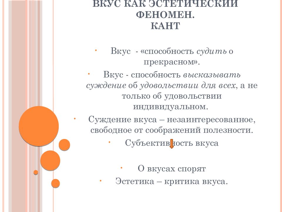 Вкус - «способность судить о прекрасном ». Вкус - способность высказывать суждение об удовольствии для всех, а не только об удовольствии индивидуальном. Суждение вкуса – незаинтересованное, свободное от соображений полезности. Субъективность вкуса О вкусах спорят Эстетика – критика вкуса.