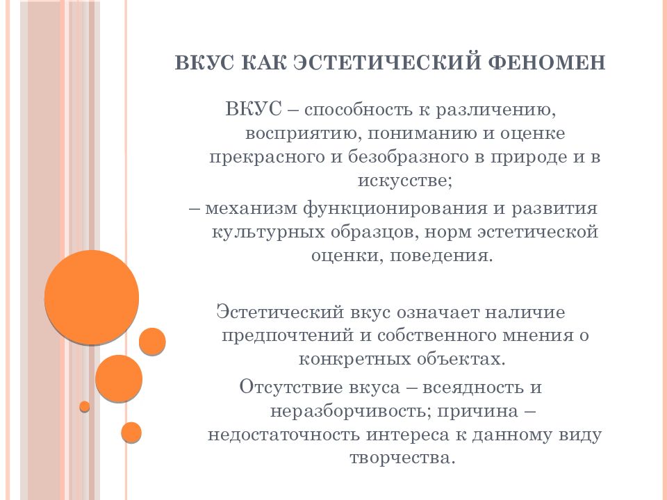 ВКУС – способность к различению, восприятию, пониманию и оценке прекрасного и безобразного в природе и в искусстве; – механизм функционирования и развития культурных образцов, норм эстетической оценки, поведения. Эстетический вкус означает наличие предпочтений и собственного мнения о конкретных объектах. Отсутствие вкуса – всеядность и неразборчивость; причина – недостаточность интереса к данному виду творчества.