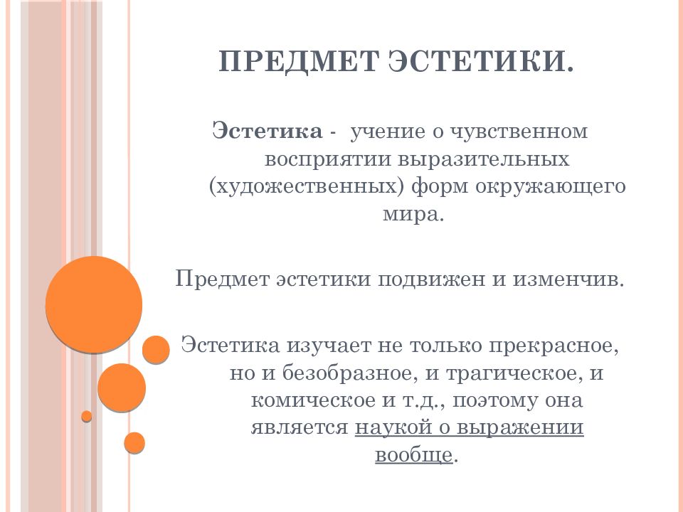 Эстетика - учение о чувственном восприятии выразительных (художественных) форм окружающего мира. Предмет эстетики подвижен и изменчив. Эстетика изучает не только прекрасное, но и безобразное, и трагическое, и комическое и т.д., поэтому она является наукой о выражении вообще.