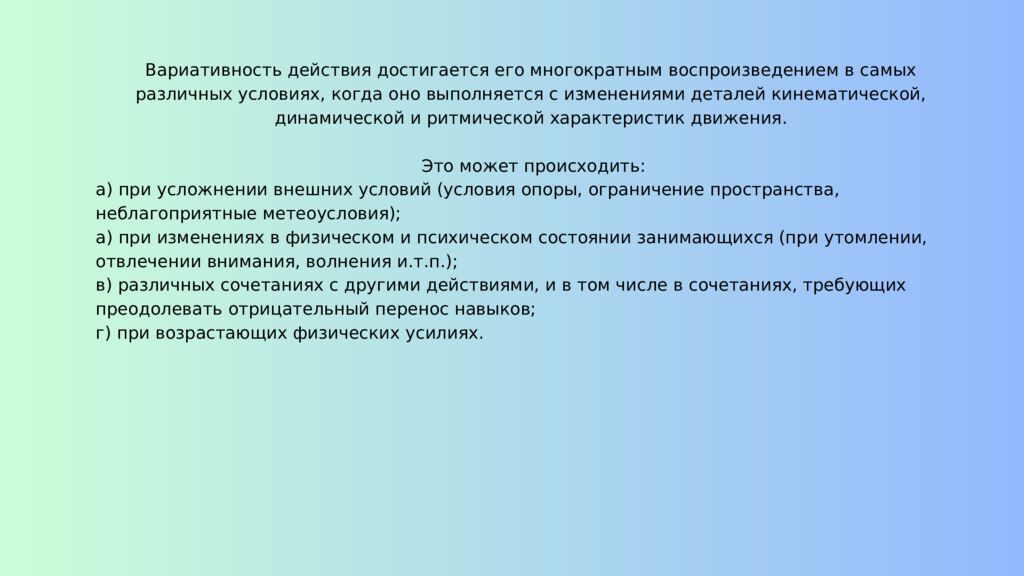 Вариа тивность действия достигается его многократным воспроизведением в самых различных условиях, когда оно выполняется с изменениями деталей кинематической, динамической и ритмической характеристик движения. Это может происходить: а) при усложнении внешних условий (условия опоры, ограничение пространства, неблагоприятные метеоусловия); а) при изменениях в физическом и психическом состоянии занимающихся (при утомлении, отвлечении внимания, волнения и.т.п.); в) различных сочетаниях с другими действиями, и в том числе в сочетаниях, требующих преодолевать отрицательный перенос навыков; г) при возрастающих физических усилиях.