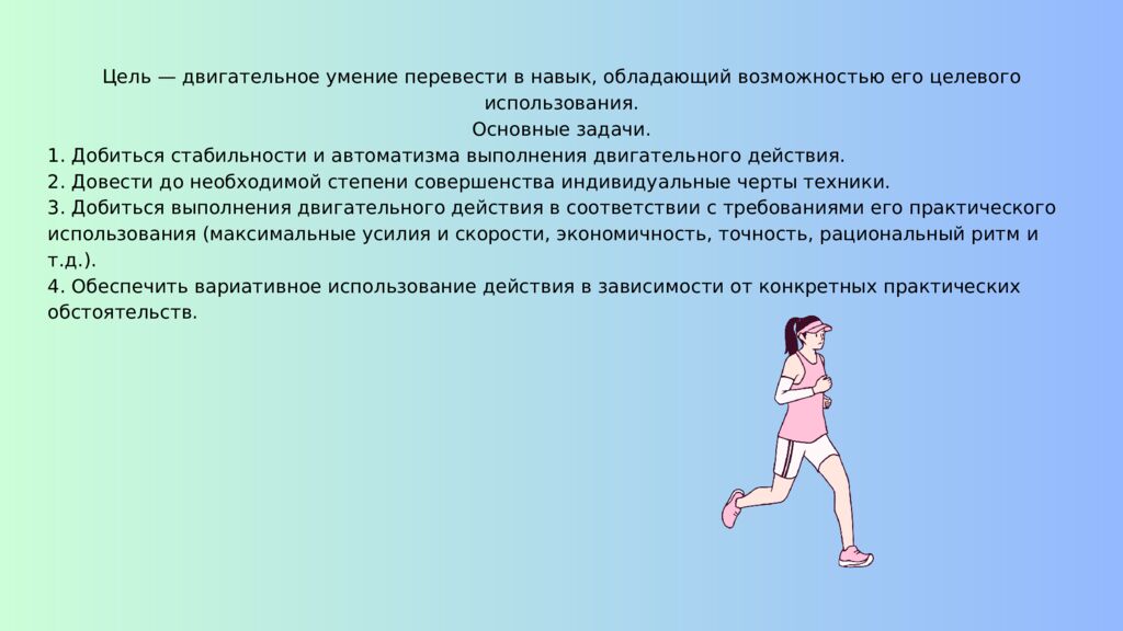 Цель — д вигательное умение перевести в навык, обладающий возможностью его целевого использования. Основные задачи. 1. Добиться стабильности и автоматизма выполнения двигательного действия. 2. Довести до необходимой степени совершенства индивидуальные черты техники. 3. Добиться выполнения двигательного действия в соответствии с требованиями его практического использования (максимальные усилия и скорости, экономичность, точность, рациональный ритм и т.д.). 4. Обеспечить вариативное использование действия в зависимости от конкретных практических обстоятельств.