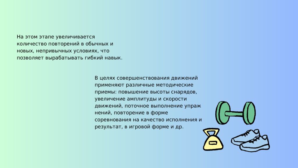 На э том этапе увеличивается количество повторений в обычных и новых, непривычных условиях, что позволяет вырабатывать гибкий навык. В целях совершенс твования движений применяют различные методические приемы: повышение высоты снарядов, увеличение амплитуды и скорости движений, поточное выполнение упражнений, повторение в форме соревнования на качество исполнения и результат, в игровой форме и др.