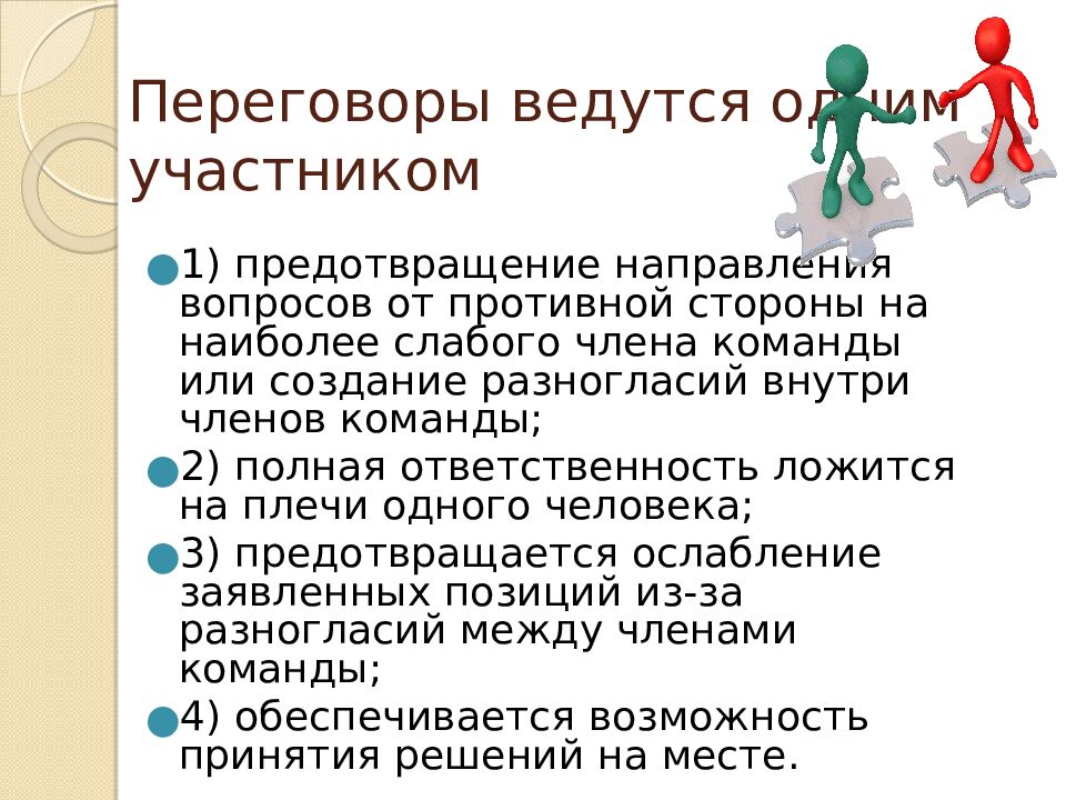 1) предотвращение направления вопросов от противной стороны на наиболее слабого члена команды или создание разногласий внутри членов команды; 2) полная ответственность ложится на плечи одного человека; 3) предотвращается ослабление заявленных позиций из-за разногласий между членами команды; 4) обеспечивается возможность принятия решений на месте.