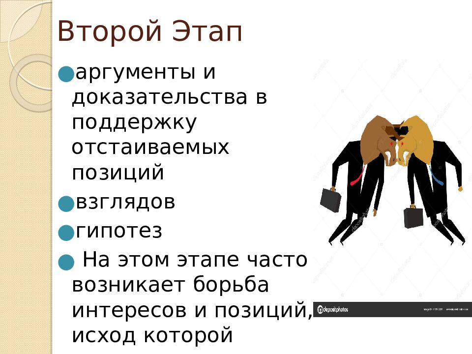 аргументы и доказательства в поддержку отстаиваемых позиций взглядов гипотез На этом этапе часто возникает борьба интересов и позиций, исход которой ложится в основу третьего этапа.