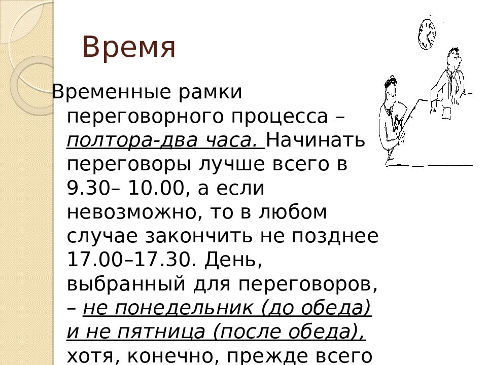 Временные рамки переговорного процесса – полтора-два часа. Начинать переговоры лучше всего в 9.30– 10.00, а если невозможно, то в любом случае закончить не позднее 17.00–17.30. День, выбранный для переговоров, – не понедельник (до обеда) и не пятница (после обеда), хотя, конечно, прежде всего нужно учесть срочность решения проблемы.