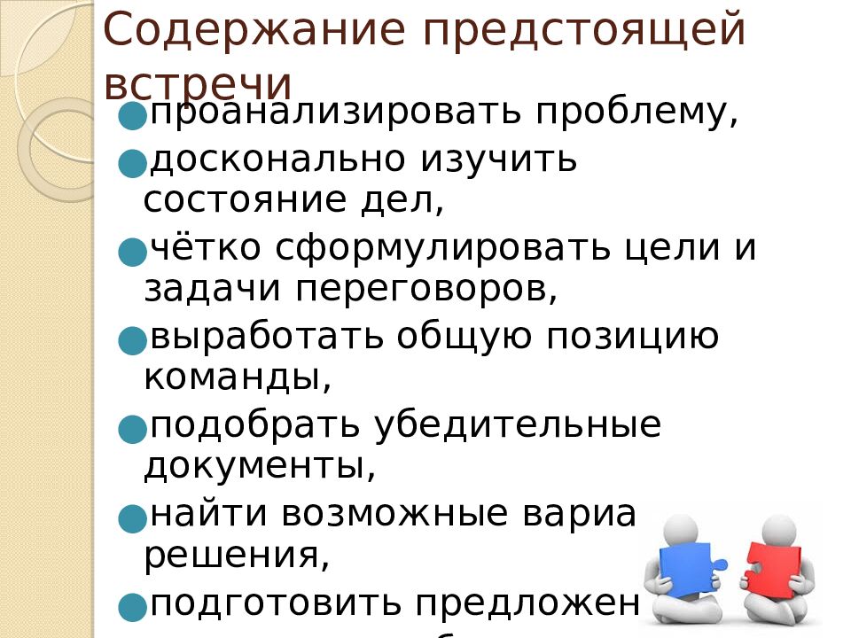 проанализировать проблему, досконально изучить состояние дел, чётко сформулировать цели и задачи переговоров, выработать общую позицию команды, подобрать убедительные документы, найти возможные варианты решения, подготовить предложения, составить необходимые документы