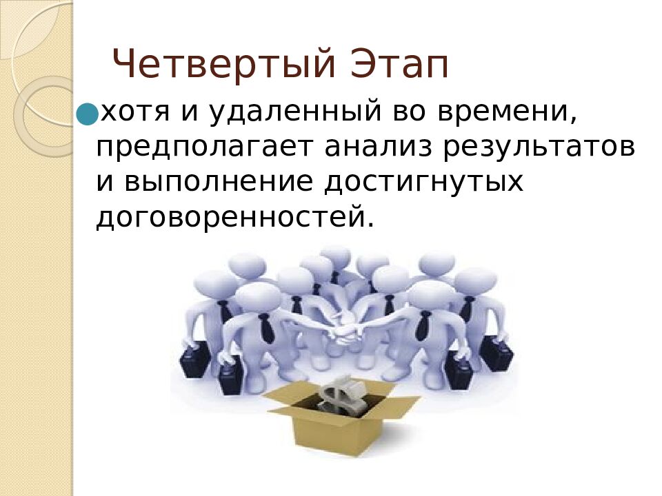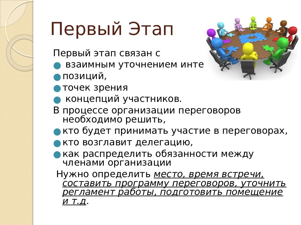 Первый этап связан с взаимным уточнением интересов позиций, точек зрения концепций участников. В процессе организации переговоров необходимо решить, кто будет принимать участие в переговорах, кто возглавит делегацию, как распределить обязанности между членами организации Нужно определить место, время встречи, составить программу переговоров, уточнить регламент работы, подготовить помещение и т.д.