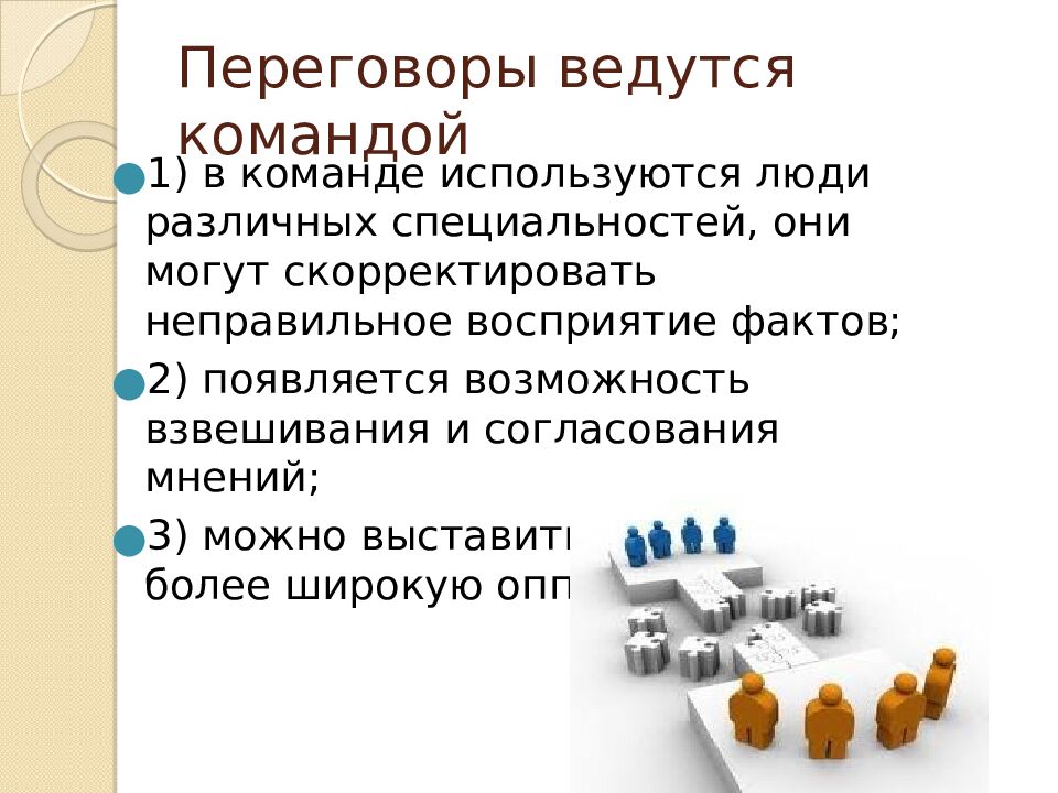 1) в команде используются люди различных специальностей, они могут скорректировать неправильное восприятие фактов; 2) появляется возможность взвешивания и согласования мнений; 3) можно выставить другой стороне более широкую оппозицию.
