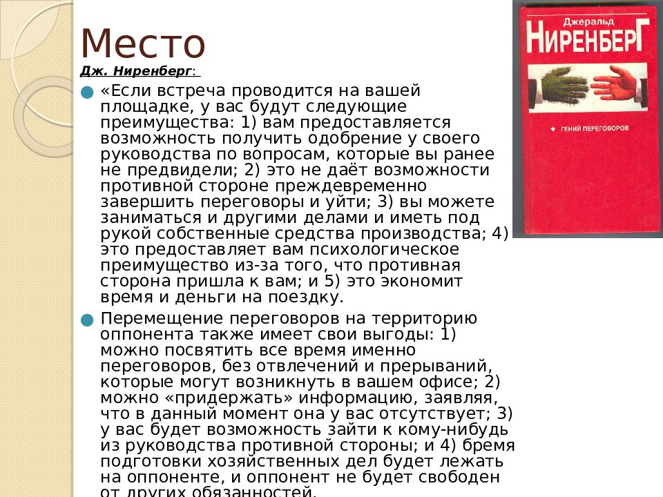 Дж. Ниренберг : «Если встреча проводится на вашей площадке, у вас будут следующие преимущества: 1) вам предоставляется возможность получить одобрение у своего руководства по вопросам, которые вы ранее не предвидели; 2) это не даёт возможности противной стороне преждевременно завершить переговоры и уйти; 3) вы можете заниматься и другими делами и иметь под рукой собственные средства производства; 4) это предоставляет вам психологическое преимущество из-за того, что противная сторона пришла к вам; и 5) это экономит время и деньги на поездку. Перемещение переговоров на территорию оппонента также имеет свои выгоды: 1) можно посвятить все время именно переговоров, без отвлечений и прерываний, которые могут возникнуть в вашем офисе; 2) можно «придержать» информацию, заявляя, что в данный момент она у вас отсутствует; 3) у вас будет возможность зайти к кому-нибудь из руководства противной стороны; и 4) бремя подготовки хозяйственных дел будет лежать на оппоненте, и оппонент не будет свободен от других обязанностей. Если ни одна из этих альтернатив не кажется удовлетворительной, можно встретиться с оппонентом на нейтральной территории».