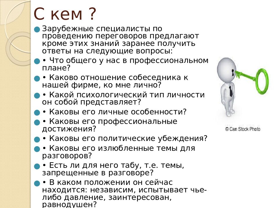Зарубежные специалисты по проведению переговоров предлагают кроме этих знаний заранее получить ответы на следующие вопросы: • Что общего у нас в профессиональном плане? • Каково отношение собеседника к нашей фирме, ко мне лично? • Какой психологический тип личности он собой представляет? • Каковы его личные особенности? • Каковы его профессиональные достижения? • Каковы его политические убеждения? • Каковы его излюбленные темы для разговоров? • Есть ли для него табу, т.е. темы, запрещенные в разговоре? • В каком положении он сейчас находится: независим, испытывает чье-либо давление, заинтересован, равнодушен? • Какой может быть его тактика ведения диалога? • Какой в этом случае должна быть моя тактика?