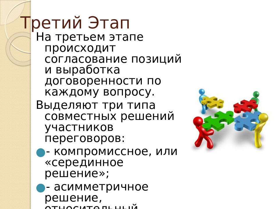 На третьем этапе происходит согласование позиций и выработка договоренности по каждому вопросу. Выделяют три типа совместных решений участников переговоров: - компромиссное, или «серединное решение»; - асимметричное решение, относительный компромисс; - принципиально новое решение, «снятие» основных противоречий.