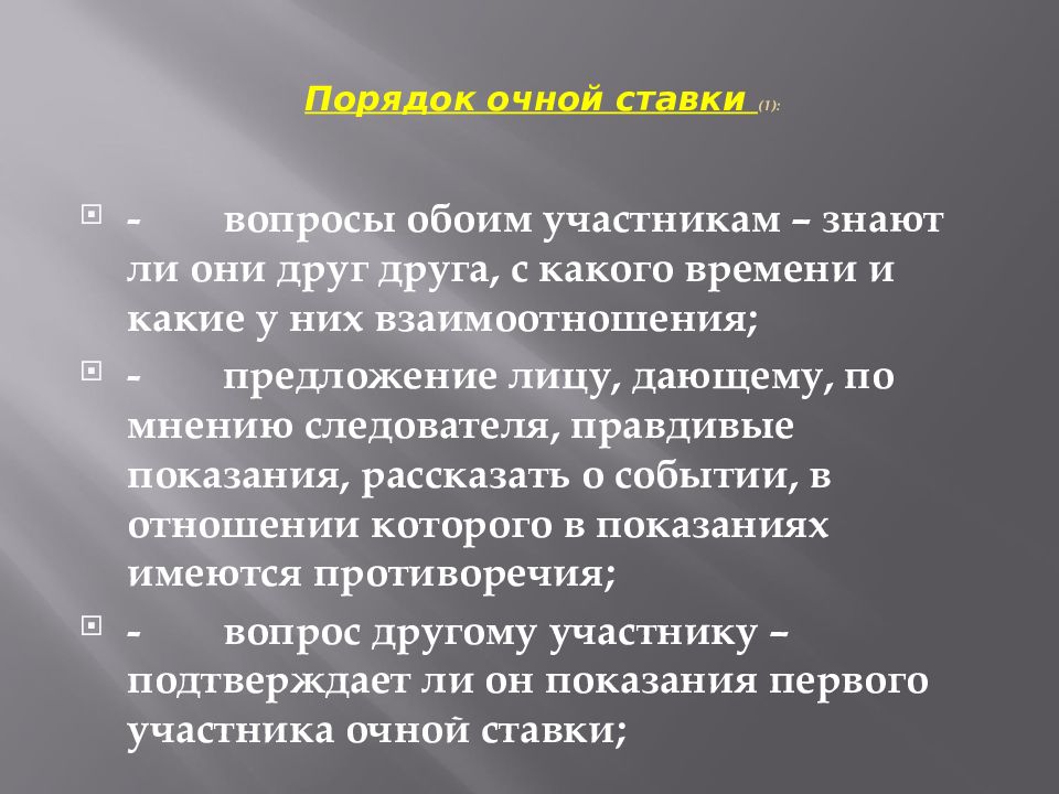 - вопросы обоим участникам – знают ли они друг друга, с какого времени и какие у них взаимоотношения; - предложение лицу, дающему, по мнению следователя, правдивые показания, рассказать о событии, в отношении которого в показаниях имеются противоречия; - вопрос другому участнику – подтверждает ли он показания первого участника очной ставки;