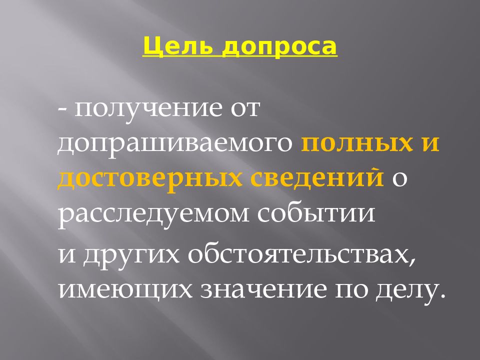 - получение от допрашиваемого полных и достоверных сведений о расследуемом событии и других обстоятельствах, имеющих значение по делу.