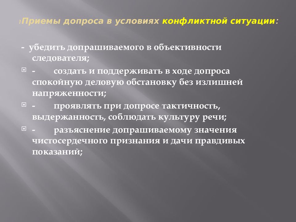 - убедить допрашиваемого в объективности следователя; - создать и поддерживать в ходе допроса спокойную деловую обстановку без излишней напряженности; - проявлять при допросе тактичность, выдержанность, соблюдать культуру речи; - разъяснение допрашиваемому значения чистосердечного признания и дачи правдивых показаний;