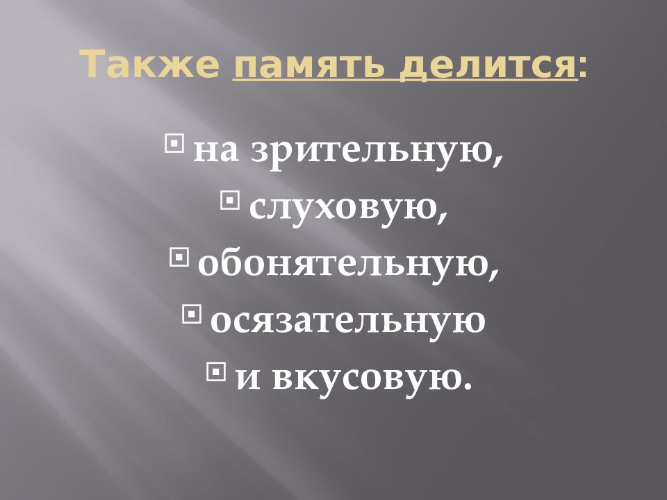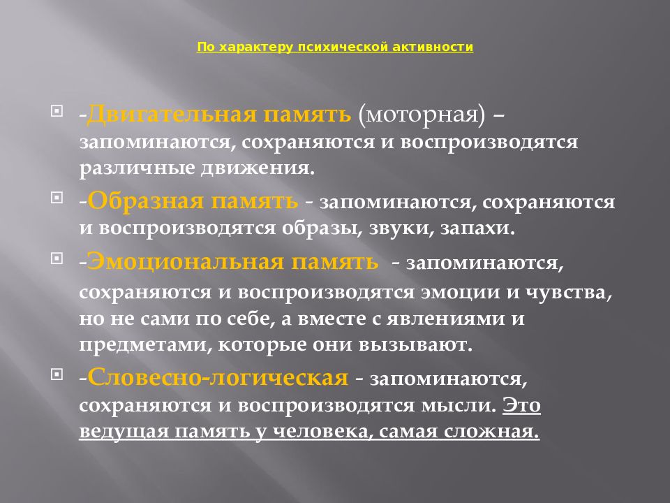 - Двигательная память (моторная) – запоминаются, сохраняются и воспроизводятся различные движения. - Образная память - запоминаются, сохраняются и воспроизводятся образы, звуки, запахи. - Эмоциональная память - запоминаются, сохраняются и воспроизводятся эмоции и чувства, но не сами по себе, а вместе с явлениями и предметами, которые они вызывают. - Словесно-логическая - запоминаются, сохраняются и воспроизводятся мысли. Это ведущая память у человека, самая сложная.
