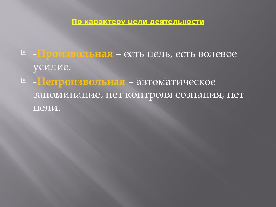- Произвольная – есть цель, есть волевое усилие. - Непроизвольная – автоматическое запоминание, нет контроля сознания, нет цели.