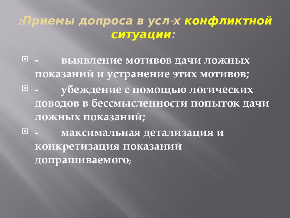 Слайд 34: 2 Приемы допроса в усл-х конфликтной ситуации :