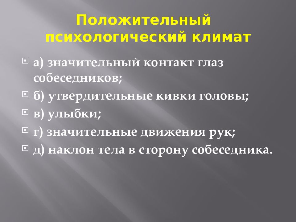 а) значительный контакт глаз собеседников; б) утвердительные кивки головы; в) улыбки; г) значительные движения рук; д ) наклон тела в сторону собеседника.