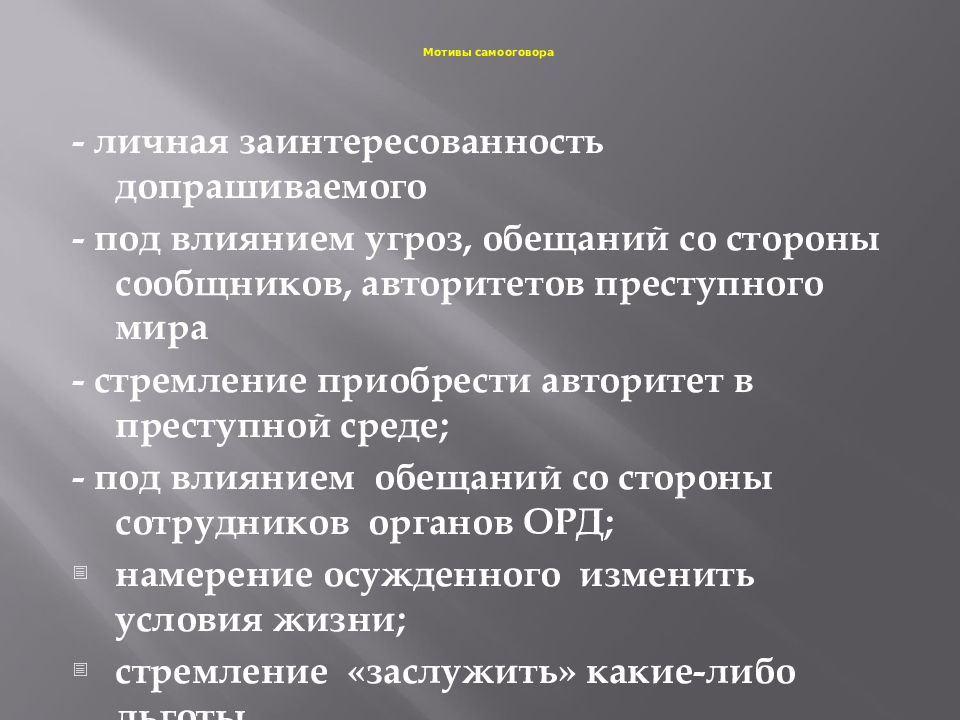 - личная заинтересованность допрашиваемого - под влиянием угроз, обещаний со стороны сообщников, авторитетов преступного мира - стремление приобрести авторитет в преступной среде; - под влиянием обещаний со стороны сотрудников органов ОРД; намерение осужденного изменить условия жизни; стремление «заслужить» какие-либо льготы.