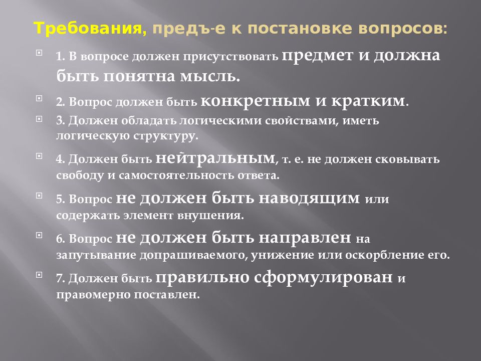 1. В вопросе должен присутствовать предмет и должна быть понятна мысль. 2. Вопрос должен быть конкретным и кратким. 3. Должен обладать логическими свойствами, иметь логическую структуру. 4. Должен быть нейтральным, т. е. не должен сковывать свободу и самостоятельность ответа. 5. Вопрос не должен быть наводящим или содержать элемент внушения. 6. Вопрос не должен быть направлен на запутывание допрашиваемого, унижение или оскорбление его. 7. Должен быть правильно сформулирован и правомерно поставлен.