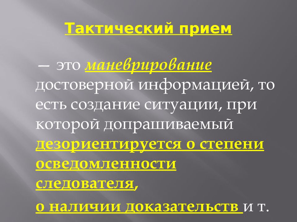 — это маневрирование достоверной информацией, то есть создание ситуации, при которой допрашиваемый дезориентируется о степени осведомленности следователя, о наличии доказательств и т. д.