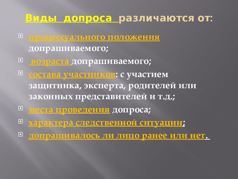 процессуального положения допрашиваемого; возраста допрашиваемого; состава участников : с участием защитника, эксперта, родителей или законных представителей и т.д.; места проведения допроса; характера следственной ситуации ; допрашивалось ли лицо ранее или нет.