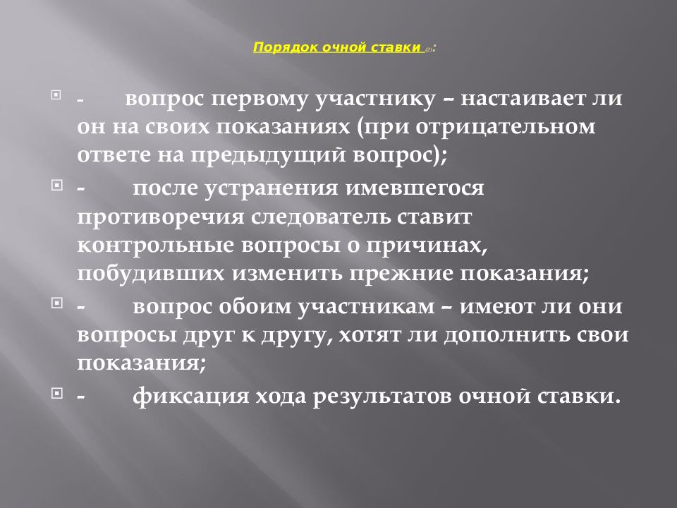 - вопрос первому участнику – настаивает ли он на своих показаниях (при отрицательном ответе на предыдущий вопрос); - после устранения имевшегося противоречия следователь ставит контрольные вопросы о причинах, побудивших изменить прежние показания; - вопрос обоим участникам – имеют ли они вопросы друг к другу, хотят ли дополнить свои показания; - фиксация хода результатов очной ставки.