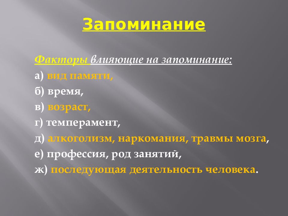Факторы влияющие на запоминание: а) вид памяти, б) время, в) возраст, г) темперамент, д) алкоголизм, наркомания, травмы мозга, е) профессия, род занятий, ж) последующая деятельность человека.