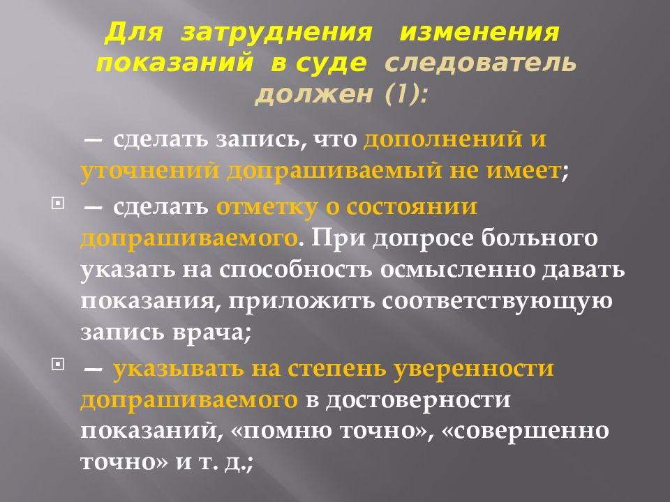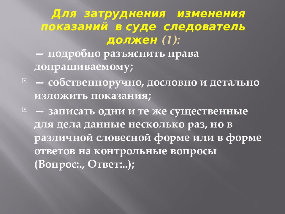 Слайд 43: Для затруднения изменения показаний в суде следователь должен (1):